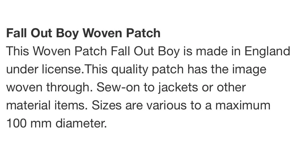 MUSIC MERCHANDISE › Fall Out Boy - Woven Band Patch Image 1 of 1 Fall Out Boy - Woven Band Patch A$14.95 Get notified by email when this product is in stock. Add To Cart Added!